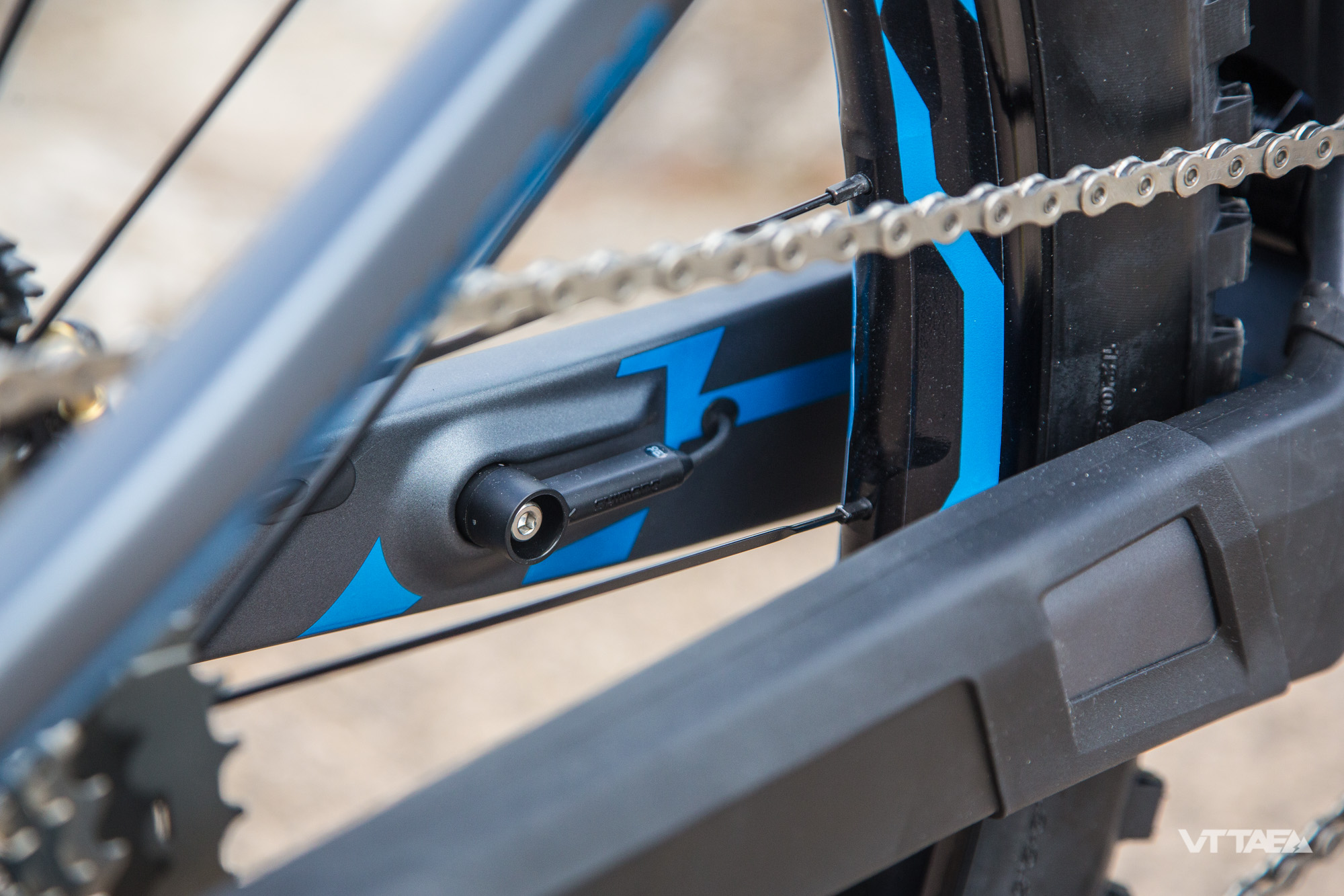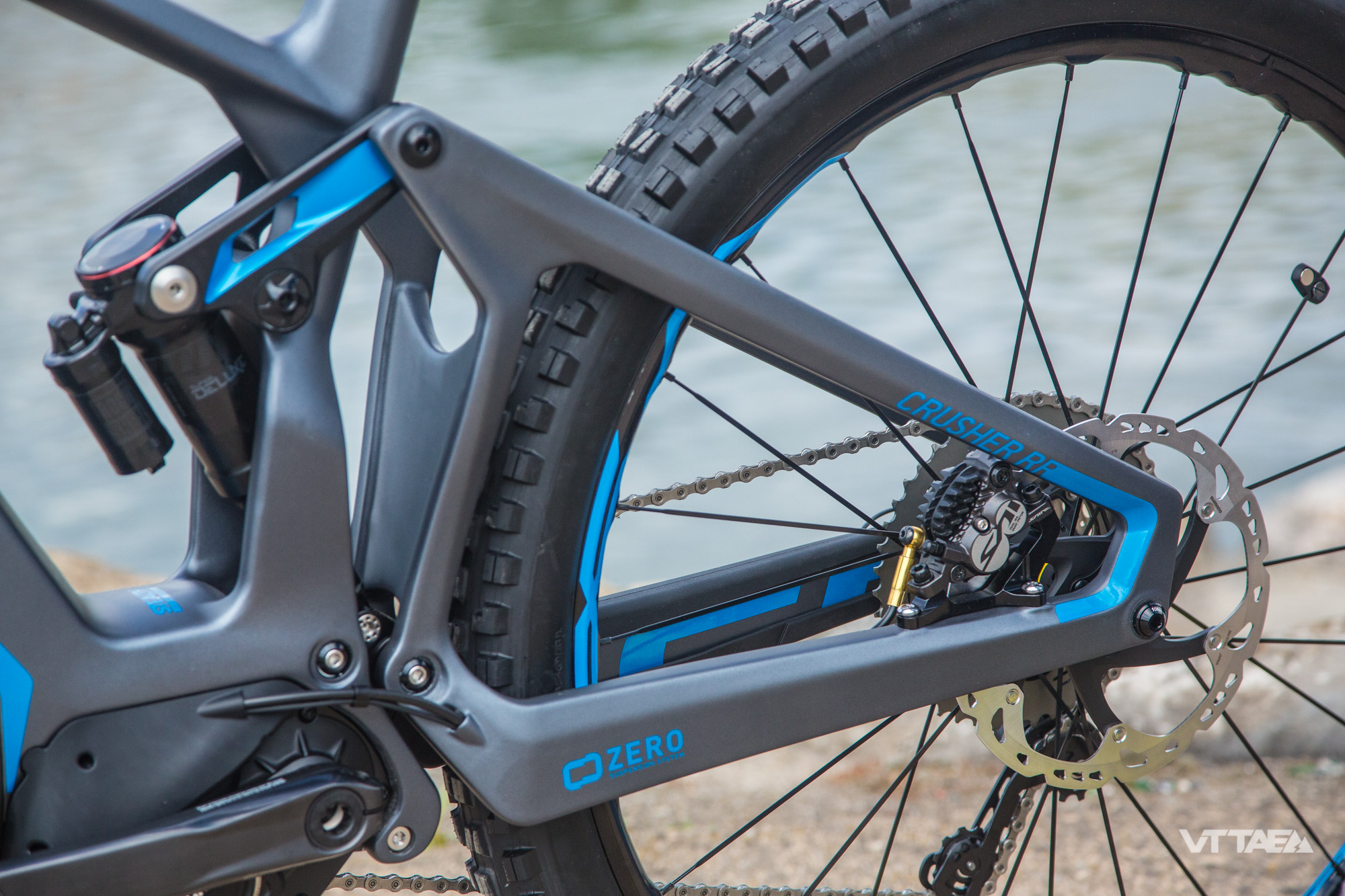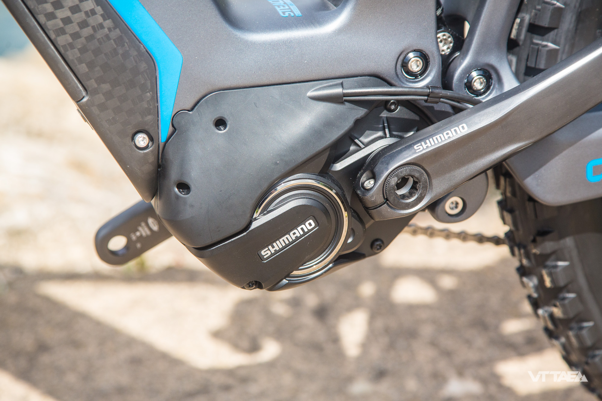 Chaussé de pneus 27+ en 2.8 et de roues larges (dont des nouvelles Mavic E-XA 27+), l’e-Crusherpropose un châssis full carbone animé par une motorisation Shimano Steps E8000 et une batterie du même fournisseur en 504Wh, particulièrement bien intégrée au tube diagonal qui reprend ledesign Stealth bien connue de la marque.