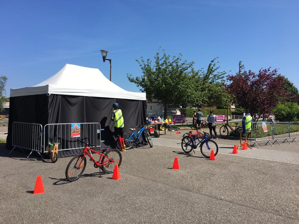 Le stand Alsace Vélo École placé idéalement à l'entré du parc a permit d'échanger sur les bonnes pratiques à vélo.